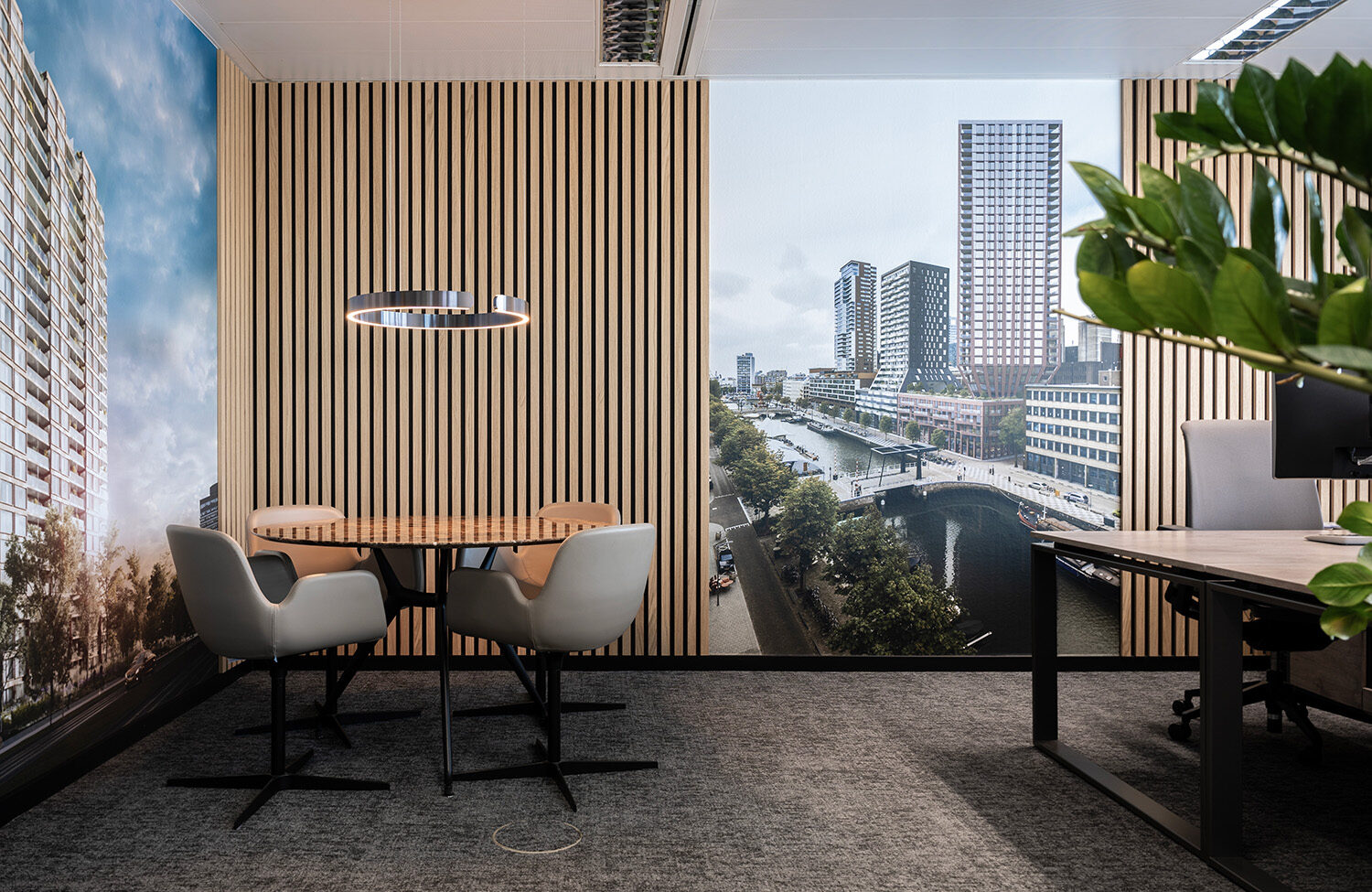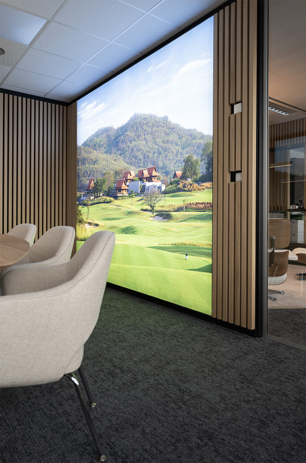 In de boardroom zijn Lumiwall verlichte wandprints verwerkt. Het resultaat is spectaculair. Door het framen van de afbeeldingen lijkt het alsof je daar bent, waar de afbeelding je heen voert, alsof je door een raam naar buiten kijkt. De houten lamellen lopen deels over de afbeelding waardoor er een 3e dimensie ontstaat. De aangebrachte Lumiwalls zijn daarnaast ook nog eens akoestisch dempend. Dit maakt de boardroom een fijne rustgevende lichte ruimte.