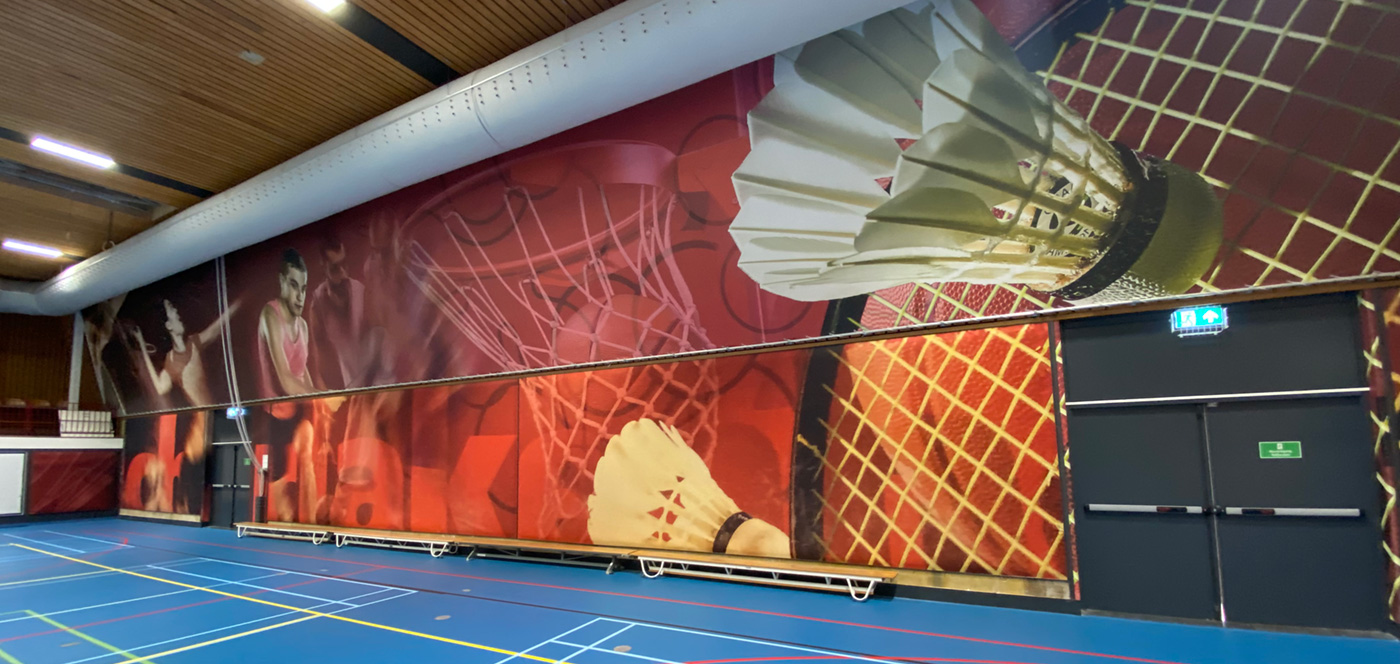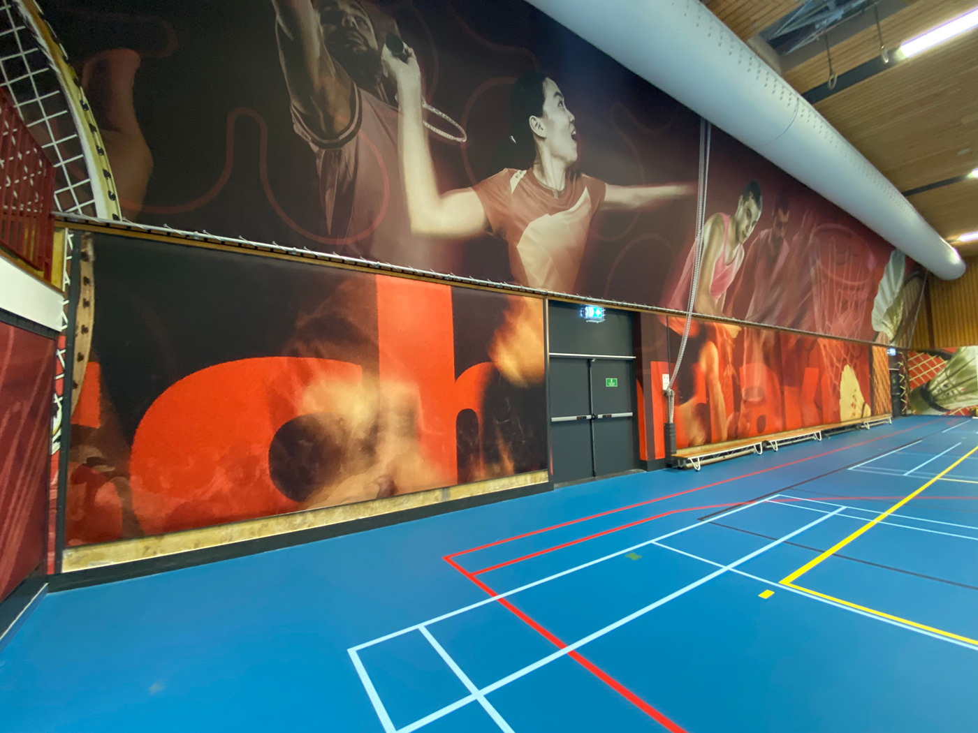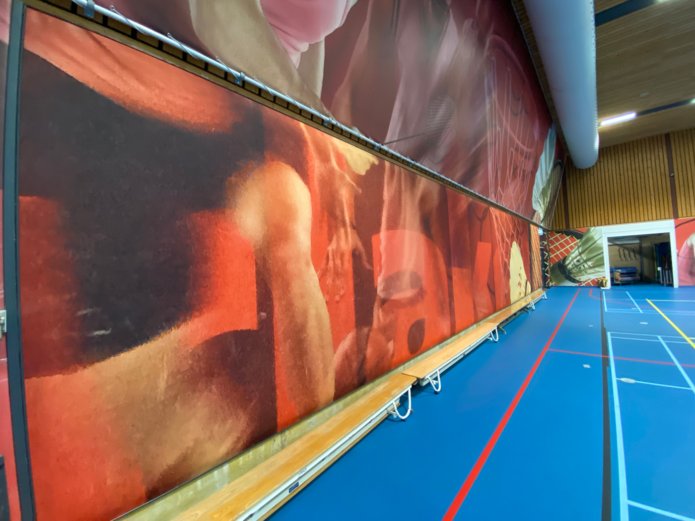 In Sporthal Scharlakenhof was al beeld aanwezig. Hoog op de wand waren grote visuals aangebracht: afbeeldingen op doek, strak ingespannen in frames. Deze visuals maakten al onderdeel uit van de uitstraling van de sporthal en moesten behouden blijven.